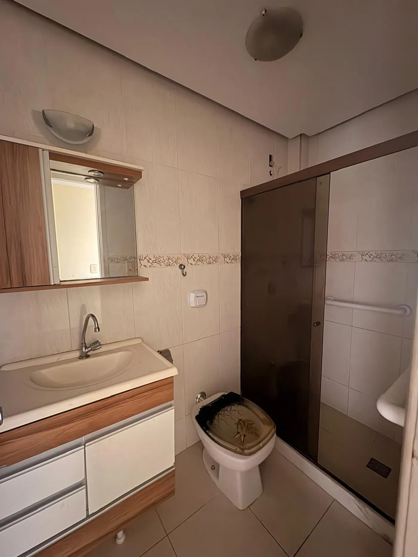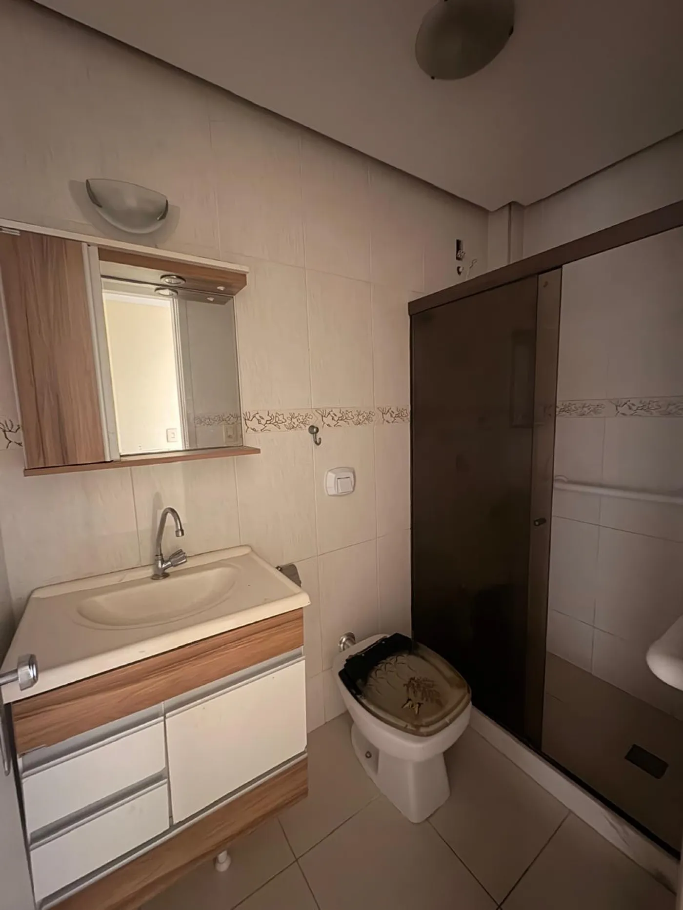 Banheiros com box Blindex, pia em granito e armários de madeira